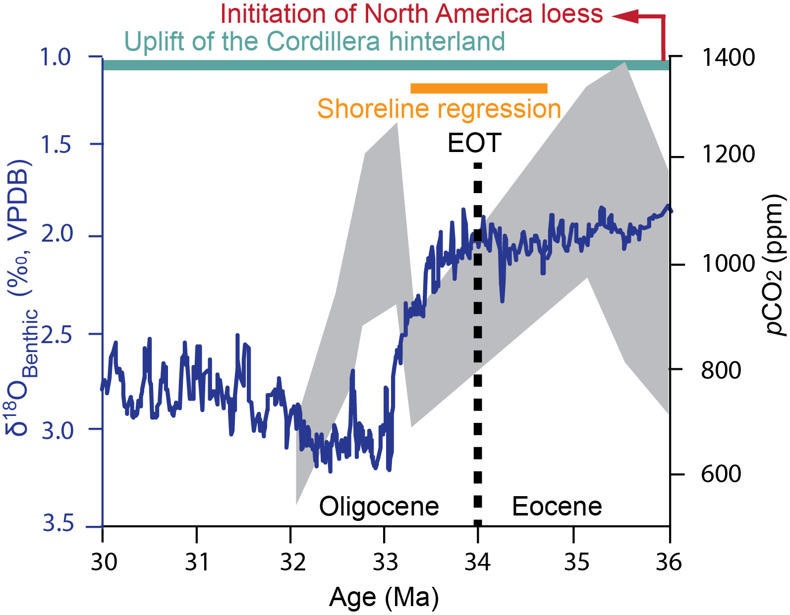 Figure shows δ¹⁸O and pCO₂ trends from 36–30 Ma with a pronounced increase in δ¹⁸O and a sharp decline in pCO₂ across the EOT. The Paleogene loess in the western US initiates before the EOT, Cordilleran uplift spans the EOT, and shoreline regression occurs across the EOT.