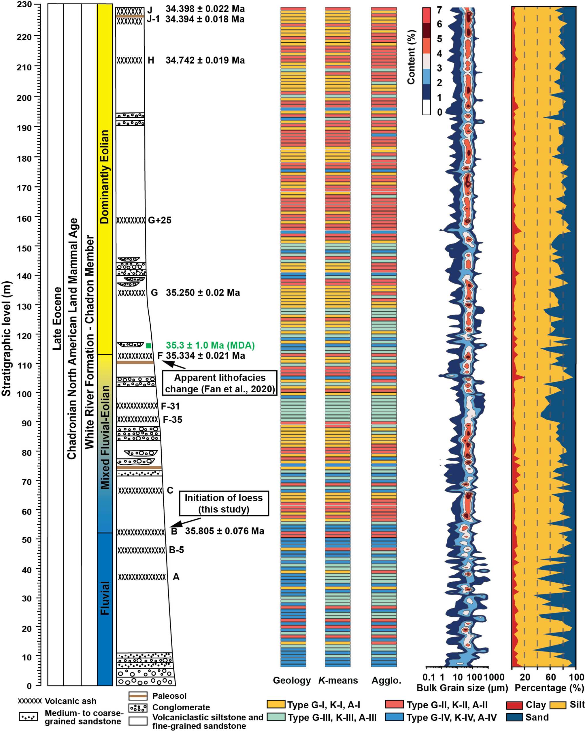Geologic and unsupervised grain-size classification panels show repeated occurrences of loess grain-size Types I–III near Ash B at Flagstaff Rim, indicating loess initiation at ~36 Ma—earlier than the ~35 Ma onset inferred by Fan et al. (2020).