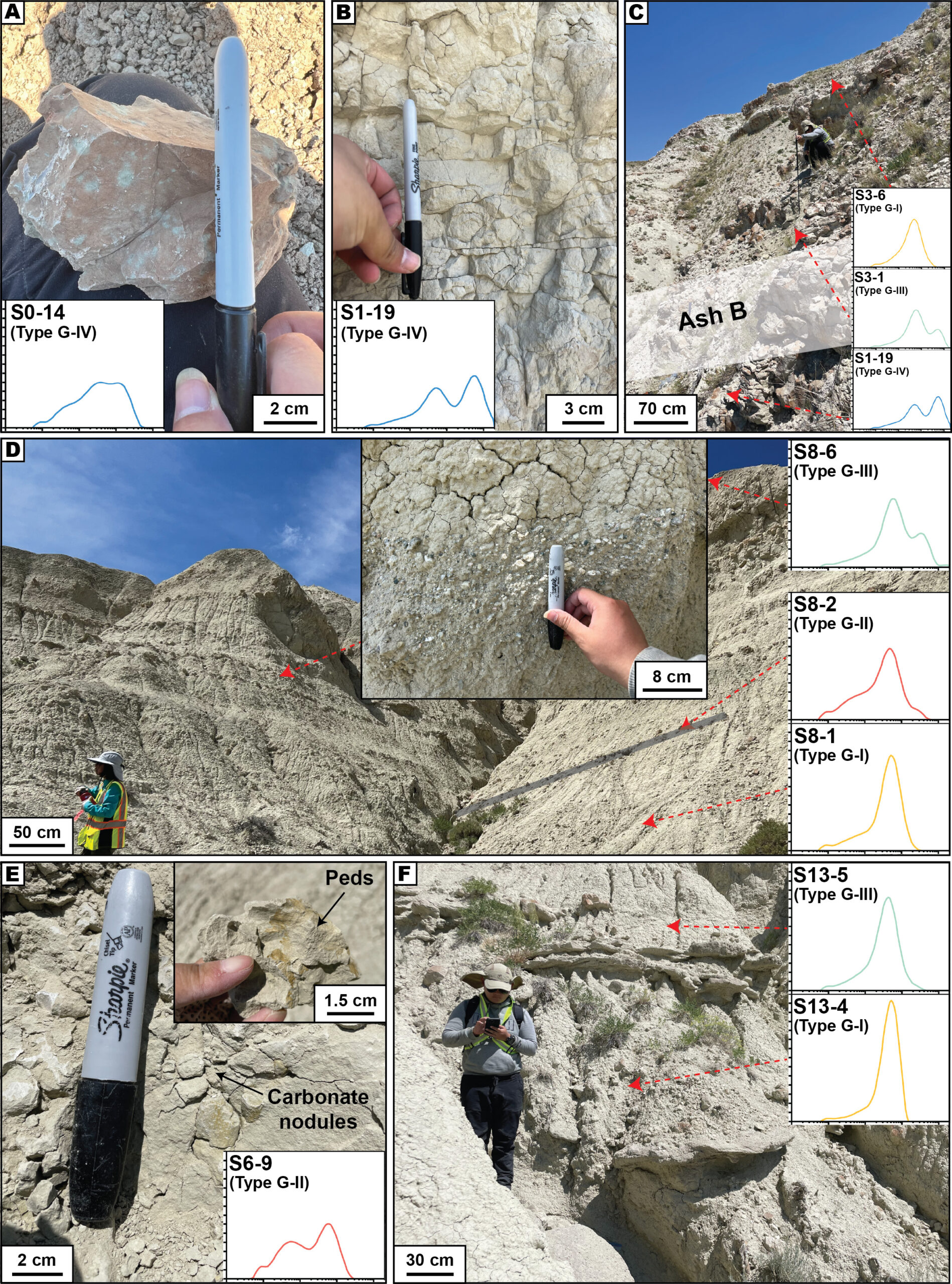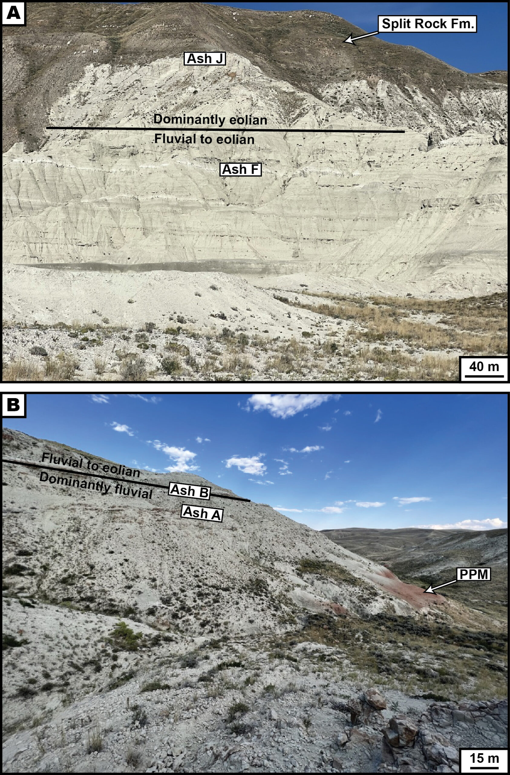 Outcrop photos show fluvial–eolian transitions at Flagstaff Rim with ash beds A, B, F, and J marking key stratigraphic levels.