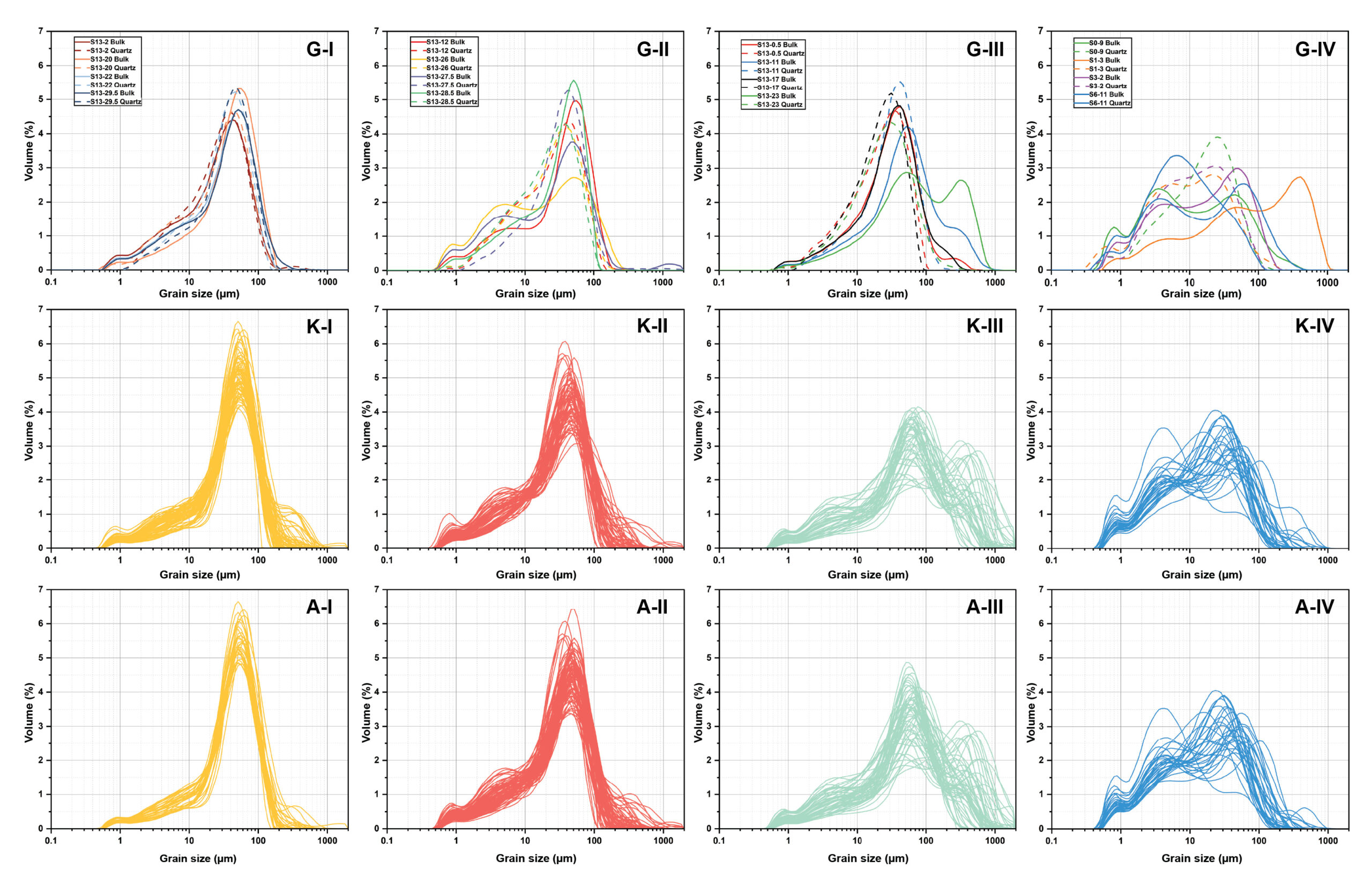Panels compare grain-size distributions for four geological types with the corresponding K-means and agglomerative clusters. Similar curve shapes across the three classifications show strong agreement in identifying sediment grain-size patterns.