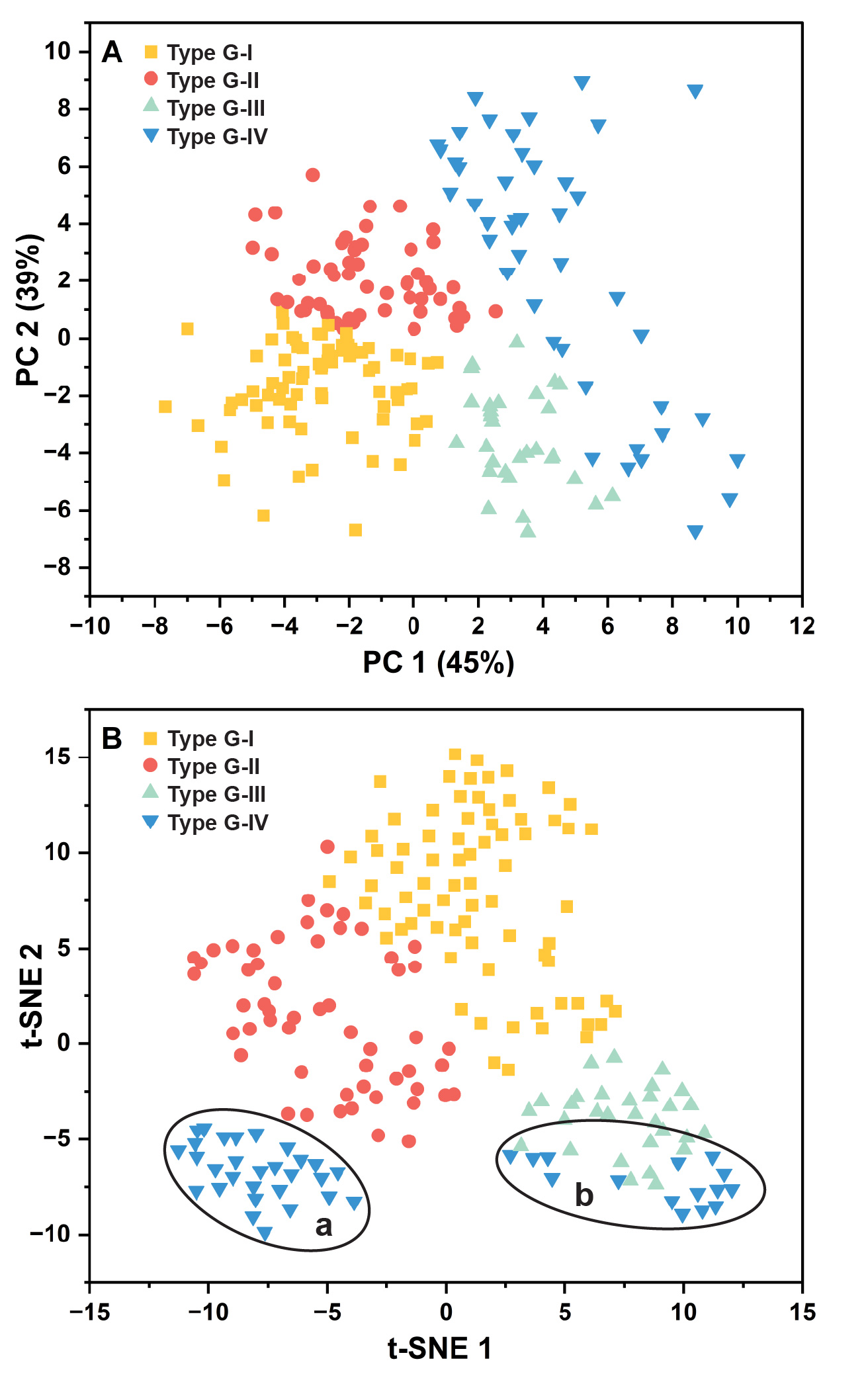 PCA and t-SNE plots show strong separation of geological grain-size Types G-I to G-IV. In the t-SNE plot, Type G-IV further splits into fine and coarse subtypes.